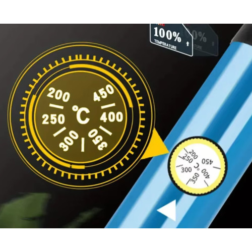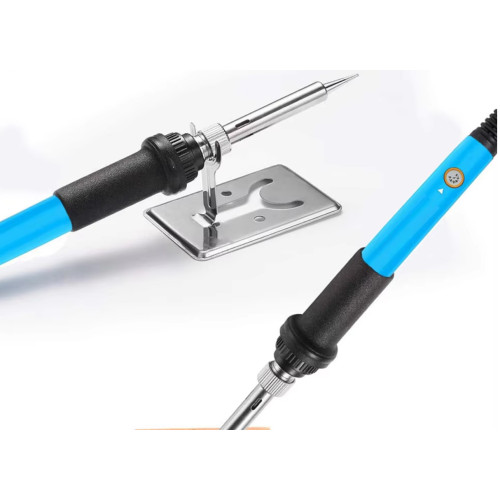 Паяльник з регулюванням температури швидко нагрівається завдяки внутрішньому керамічному нагрівачу, стабільно утримує тепло й не потребує окремої станції — просто підключіть і працюйте. Металевий корпус із полірованої легованої сталі витривалий до щоденного використання, а зручна ручка забезпечує контроль під час пайки.