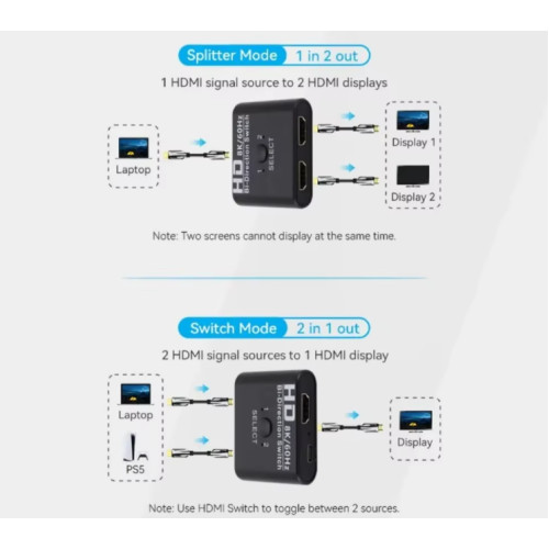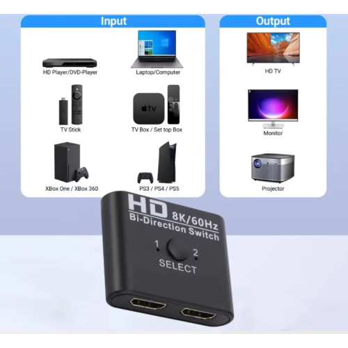 Бінаправлений hdmi перемикач 4k 60hz дає змогу зручно керувати кількома джерелами сигналу без перекомутовування кабелів. Це компактний бінаправлений hdmi спліттер формату 2x1/1x2: підключайте два пристрої до одного екрана або один пристрій до двох дисплеїв (робота почергово). Ручна кнопка забезпечує швидке перемикання, а світлодіодний індикатор підказує активний канал.