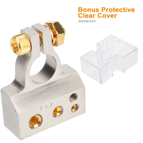 Кожна клема має чотири виходи під кабелі: два під 2GA та два під 8/10GA. Це дозволяє акуратно розвести живлення на основні та додаткові споживачі, зберігаючи надійний контакт без зайвих перехідників. Прозорий пилозахисний корпус оберігає з'єднання від забруднень і пилу.