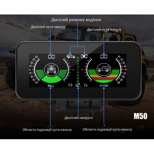 Інтелектуальний автомобільний монітор нахилу з GPS M50 — універсальний автомобільний гаджет для подорожей, бездоріжжя та міста. Як інклінометр для авто, він точно показує кут нахилу кузова, висоту та швидкість, а також працює як монітор напруги в автомобілі. Дані GPS оновлюються щосекунди, тож вимірювання кута нахилу авто і швидкості завжди актуальні.