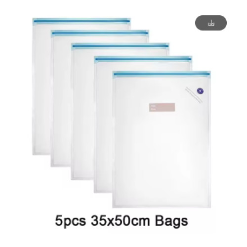 Набір із 5 штук зручно використовувати для сімейних запасів: м’ясо, риба, овочі, фрукти, зелень, сухофрукти та готові страви. Великі розміри 35×50 см підходять для об’ємних порцій і економлять місце в холодильнику та морозильній камері.