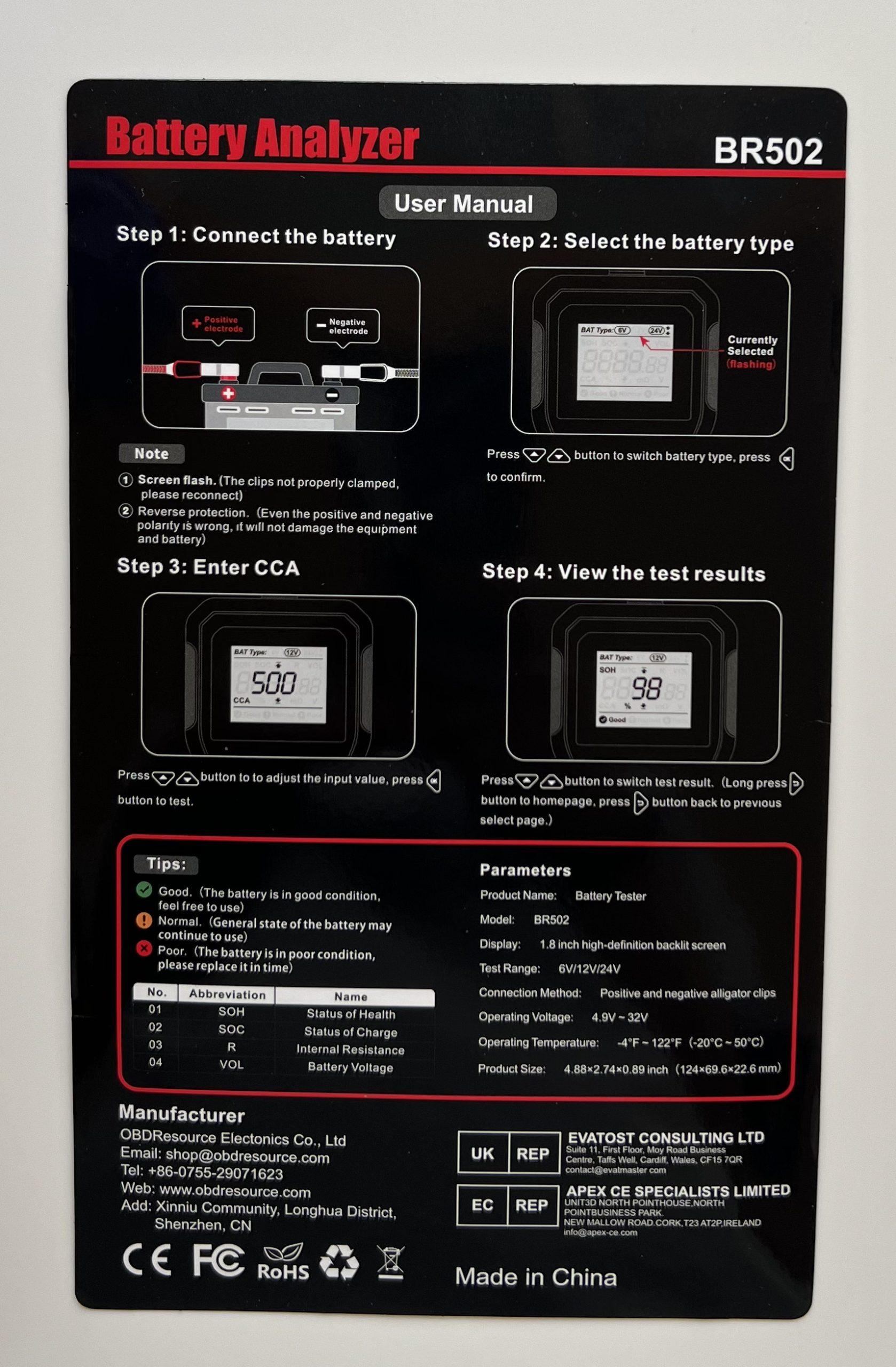 Його робочий діапазон напруги – 6V–24V. Тестер для перевірки акумуляторів придатний для різних транспортних засобів. Використовується для мотоциклів, легкових авто, вантажівок. BR502 визначає внутрішній опір батареї для оцінки рівня її зносу.