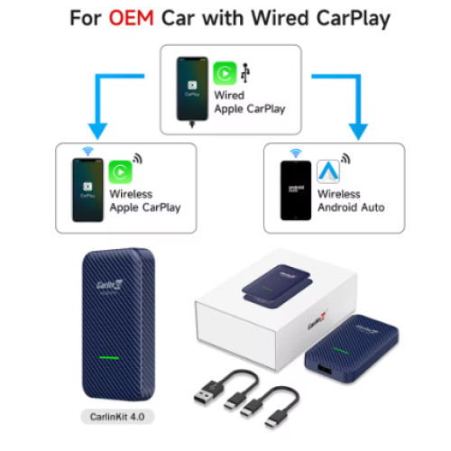 Carlinkit 4.0 CPC200-CP2A — компактний бездротовий адаптер для авто, що переводить штатний провідний CarPlay або Android Auto у бездротовий режим без втручання в систему автомобіля. Це зручний перетворювач провідного на бездротове для підключення телефону до мультимедіа з мінімумом дій з боку водія.