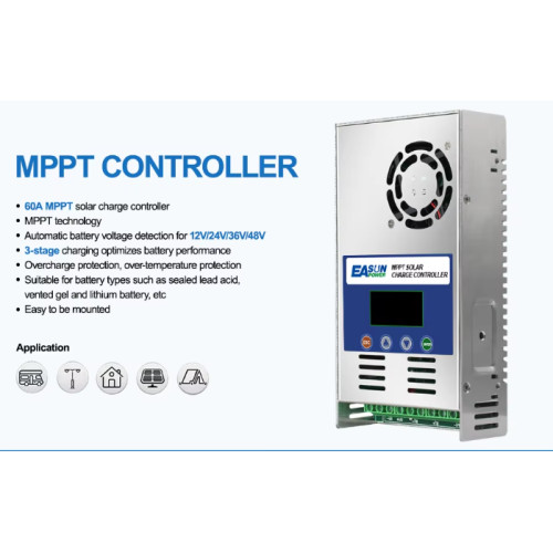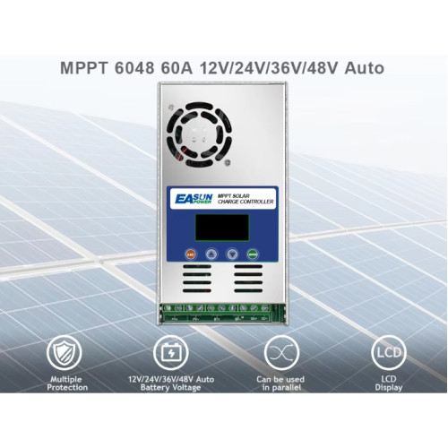 EASUN POWER 60A MPPT контролер заряду та розряду створений для максимально ефективної роботи з сонячними батареями у системах на 12/24/36/48V. Це надійний контролер заряду сонячних батарей із алгоритмом MPPT, що витискає максимум потужності з масиву панелей і стабільно працює з літієвими та свинцево-кислотними АКБ.