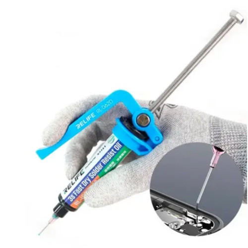 Екстрактор-дозатор RL-062D створений для акуратної та контрольованої подачі флюсу, паяльної пасти й клею. Це ручний дозатор 5–10 мл зі штовхачем і важелем, який забезпечує дозоване нанесення флюсу навіть на дрібні контактні майданчики.