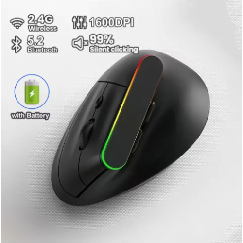 Ергономічна вертикальна миша RGB, Bluetooth 5.2 + 2.4G, безшумна, 6 кнопок, чорна, вбудований акумулятор