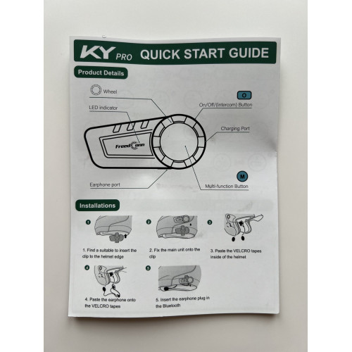 Freedconn KY Pro — мотоциклетна Bluetooth-гарнітура для шолома з надійним Qualcomm-чіпом та захистом IP65. Пристрій забезпечує стабільний інтерком для шолома на дистанції до 2000м у групі до 6 людей, підтримує підключення двох смартфонів, роботу з GPS/MP3 і пропонує чисту передачу голосу завдяки CVC 8.0. Це універсальна мотоциклетна bluetooth гарнітура для поїздок соло та в колоні.
