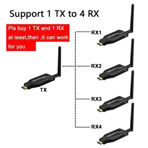- Дальність у відкритому просторі: до 50 м для конфігурації 1 TX → 1 RX; працює як бездротовий hdmi подовжувач 50 м у межах заявлених умов.