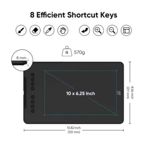 - 8 програмованих експрес‑клавіш — налаштуйте часті дії під себе: це зручний планшет з 8 експрес клавішами для швидшого робочого потоку.