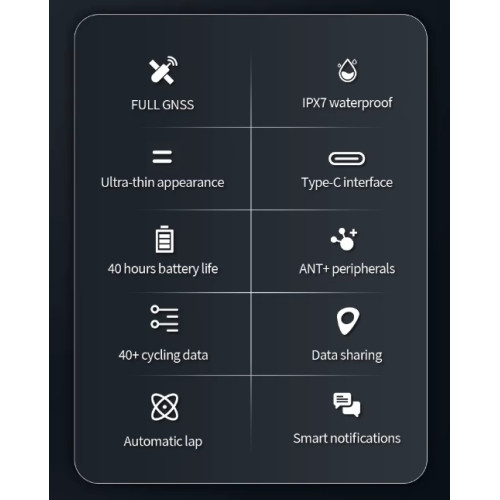 Модель виконує роль повноцінного велокомп'ютера для велосипеда: є цифровий секундомір для велотренувань і велокомп'ютер з одометром для накопичення загального кілометражу. Автоматичне збереження та синхронізація тренувань допомагають відстежувати прогрес і аналізувати ефективність поїздок.
