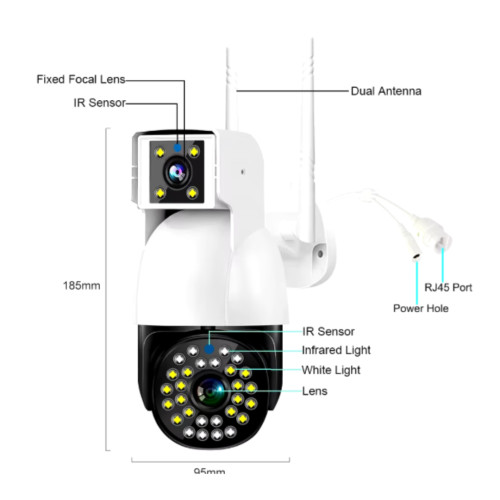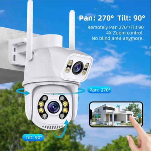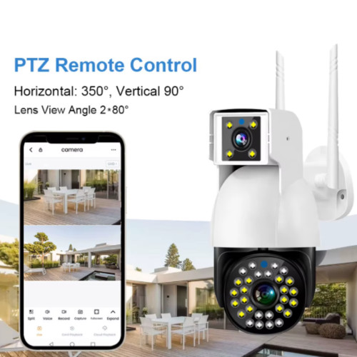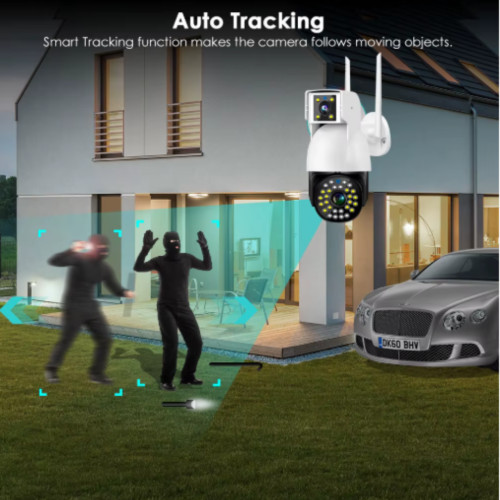 Зовнішня водонепроникна IP‑камера з подвійним об’єктивом призначена для надійного нагляду за подвір’ям, будинком чи офісом. Підтримує Wi‑Fi або 4G SIM, має PTZ‑керування та інтелектуальне автостеження руху для стабільного контролю 24/7.