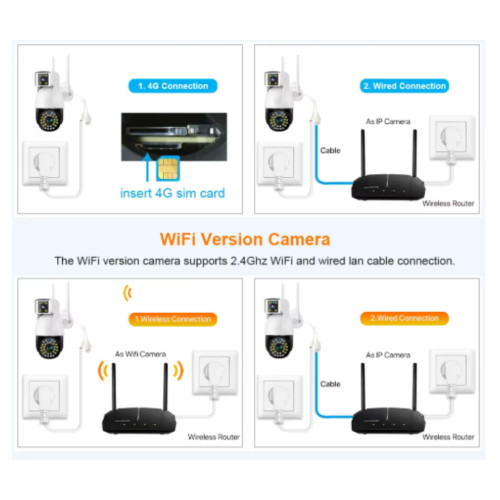 Ця зовнішня камера відеоспостереження поєднує мобільність і просте встановлення: як Wi‑Fi камера для вулиці, так і 4G SIM камера відеоспостереження, вона легко інтегрується у ваш сценарій безпеки. Це вулична IP камера та PTZ камера зовнішня з автостеженням, що забезпечує впевненість і контроль.
