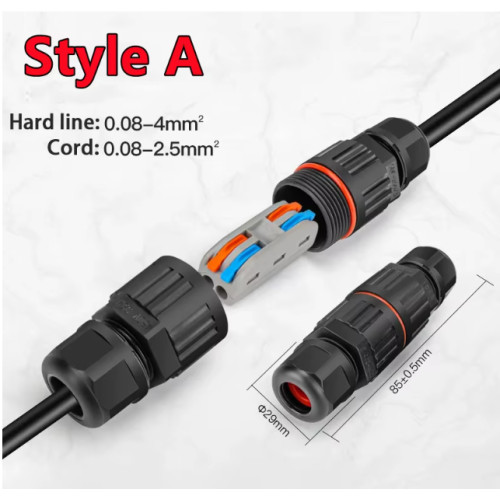 IP68 з’єднувальний роз’єм Style A — безпаяльний з’єднувач для швидкого та надійного підключення 2 або 3 жил у вимогливих умовах. Це водозахищений конектор із силіконовим ущільненням і еластичними вводами, що утворюють герметичний конектор для проводів навіть під час опадів чи при тимчасовому зануренні. Підходить як роз’єм для вулиці, садового та домашнього освітлення, у тому числі як конектор для LED ламп/стрічок та роз’єм для сонячних панелей.
