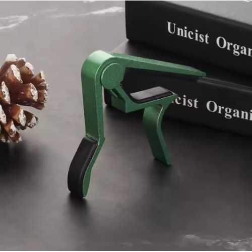 Зелений каподастр для гітари з алюмінієвого сплаву — легке та надійне рішення для швидкої зміни тональності без переналаштування інструмента. Алюмінієвий каподастр поєднує міцність і малу вагу, а м'які гумові накладки забезпечують щільний притиск струн і захист грифа.