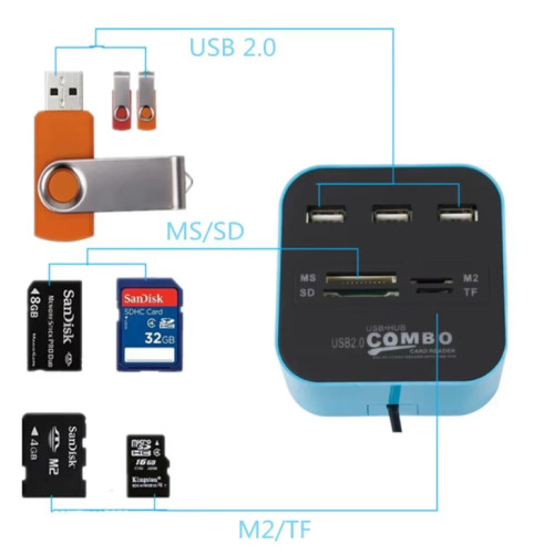 Це usb хаб 3 порти формату USB 2.0 з вбудованим картрідером для карт SD/MMC/TF/MS/M2. Комбінований usb хаб кардрідер допомагає швидко підключати носії та периферію, перетворюючи пристрій на зручний usb концентратор для пк і ноутбуків.