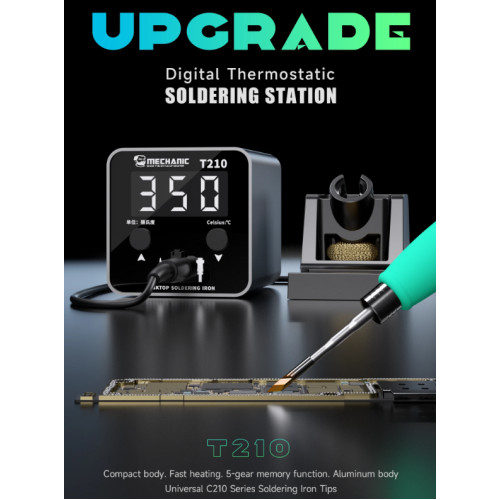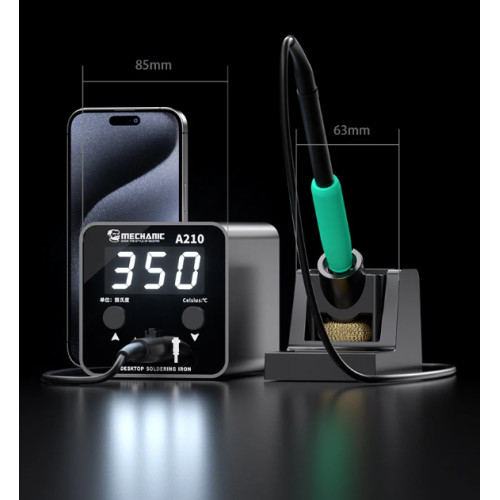MECHANIC A210 — настільна цифрова паяльна станція для електроніки та плат. Діапазон 180–450 °C, потужність 50 Вт, живлення AC 110–240 В, сумісність із жалами C210 і T12.