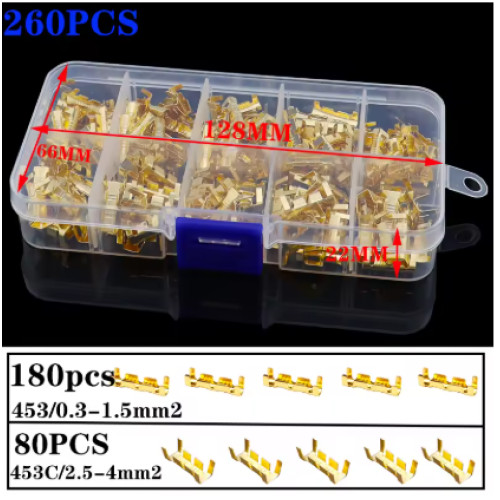 Набір клем 260 шт — це практичні U-клеми з латуні для швидкого та надійного монтажу. Обтискні клеми забезпечують стабільний контакт у низьковольтних ланцюгах і підходять як клеми для мідних проводів у побутовій та промисловій електроніці, а також для автоелектрики. Діапазон провідників — 0.3–4.0 мм², що робить цей набір зручним рішенням для різних задач.