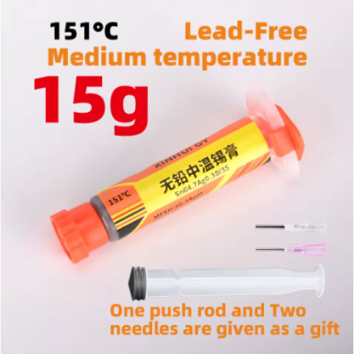 Ця паяльна паста середньотемпературна і безсвинцева паяльна паста розрахована на 151°C, тож підходить для точного монтажу та ремонту електроніки. Рівномірна паяльна паста фракція 20–38 мкм і сплав Sn64.7/Ag0.3/Bi35 забезпечують чисті паяні шви та стабільне змочування. Паста постачається як паяльна паста у тубі з голчастим носиком для дозованого нанесення на контактні майданчики.