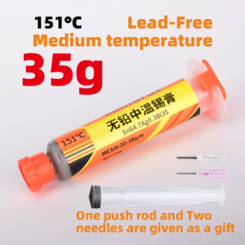 Паяльна паста середньотемпературна XH-ZG151 у фасуванні 35 г — безсвинцева суміш Sn64.7/Ag0.3/Bi35 з температурою плавлення 151°C і дрібною фракцією 20–38 мкм. Голчаста туба забезпечує зручне, точне дозування під час ремонту та монтажу електроніки.