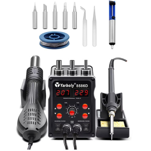 Yarboly 8586D — це паяльна станція 2-в-1 для ремонту електроніки з термофеном і паяльником у одному корпусі (версія тип Е). Завдяки PID контролю та мікроконтролеру SAMSUNG інструменти дуже швидко нагріваються і тримають стабільну температуру з точністю ±1°C. Подвійні LCD-дисплеї, ESD захист паяльної станції та інтелектуальне охолодження забезпечують безпечну і передбачувану роботу як у майстерні, так і в домашніх умовах.