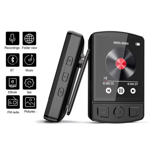 Компактний портативний mp3 плеєр bluetooth з кольоровим екраном 1.77 дюйма — зручний мультимедійний гаджет для музики, книг і фото. Це mp3 плеєр з динаміком і мікрофоном: слухайте треки через вбудований динамік або підключайте бездротові навушники/колонки по Bluetooth 5.2. Є сенсорні кнопки, міцний корпус із загартованим склом та кліпса для фіксації на одязі.