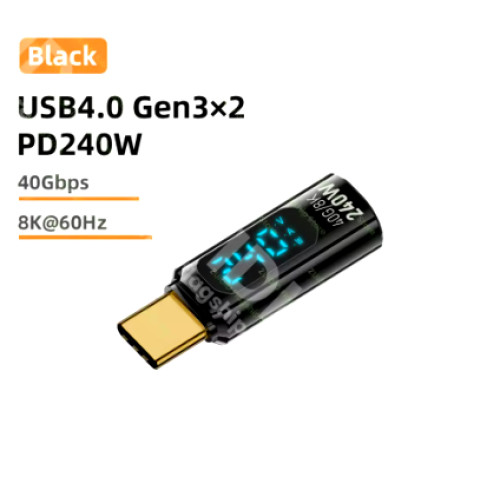 Повнофункціональний адаптер USB‑C 240 Вт — компактний перехідник Type‑C з дисплеєм формату «тато»—«мама», що підтримує USB4 40 Гбіт/с, PD3.1 EPR та відеовихід 8K 60 Гц. Це надійне рішення для швидкої зарядки, передавання даних і трансляції зображення у високій роздільній здатності.