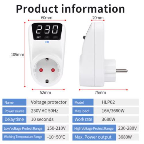 - Регульовані пороги спрацювання: низька напруга 150–210 В, висока 230–280 В — ви самі задаєте межі.