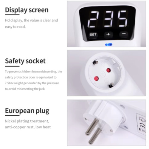 - Під'єднуєте до мережі 230 В (розетка для 230 В 50 Гц) і задаєте пороги.