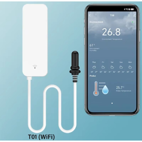 T01 — розумний датчик температури для дому та датчик вологості для теплиці; як термогігрометр Wi‑Fi і датчик із зовнішнім термодатчиком він допомагає ефективно керувати мікрокліматом.