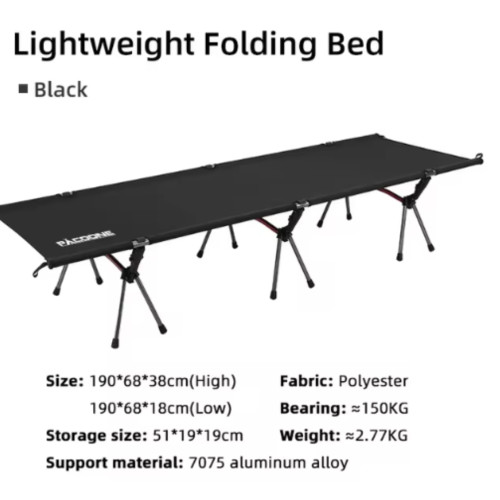 Складане ліжко для кемпінгу створене для комфортного відпочинку на природі, у фургоні чи як додаткове спальне місце вдома. Міцна рама з авіаційного алюмінію 7075 у поєднанні з тканиною Oxford 420D забезпечують надійність і довговічність при малій вазі — лише 2,7 кг. Ліжко витримує до 150 кг, має розміри 190×68×38 см у розкладеному стані та складається до компактних 50×20 см.