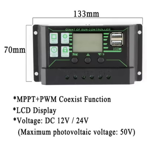 - Комплектація: сонячний контролер з РК-дисплеєм і двома USB портами.