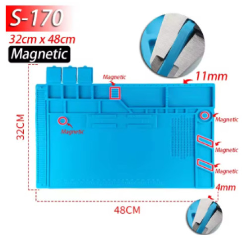Силіконовий килимок для пайки S-170 (magnetic) — термостійкий робочий мат з ESD‑захистом. Завдяки стійкості до 500°C та антиковзній поверхні він захищає стільницю, впорядковує гвинти й дрібні компоненти, підходить для точного ремонту електроніки.