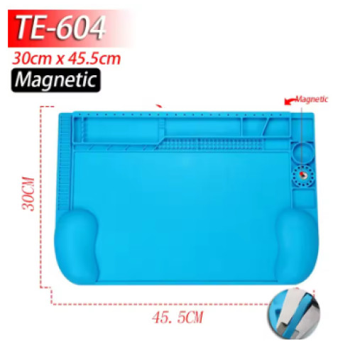 TE604 — силіконовий килимок для паяльних робіт з магнітними зонами. Це термостійкий килимок для пайки та антистатичний килимок для ремонту, що витримує до 500°C і захищає стільницю від перегріву та пошкоджень. Підходить як килимок для ремонту електроніки (смартфони, ноутбуки, годинники, плати), а також як килимок для паяльника 500°C.