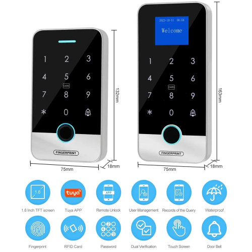 Кольоровий 1.8'' TFT забезпечує наочне меню та швидке введення пароля через екранну клавіатуру. Корпус з класом захисту IP65 дозволяє встановлення як у приміщенні, так і на вулиці — водозахищений IP65 контролер працює стабільно в різних умовах. Через застосунок Tuya APP доступні додавання користувачів, дистанційне розблокування та перегляд журналу подій доступу.