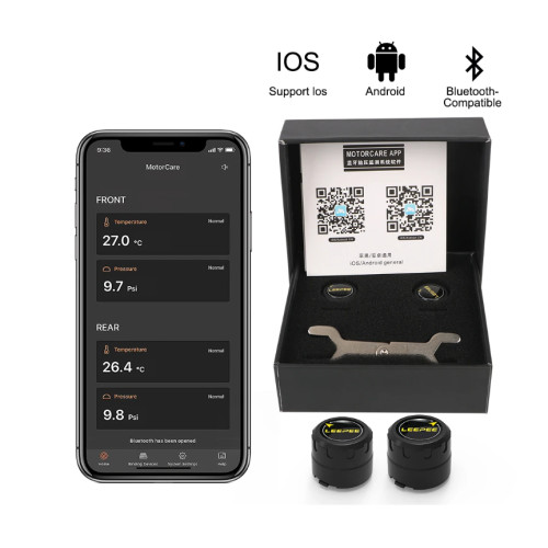 TPMS Bluetooth для мотоцикла — компактна система контролю тиску шин із двома зовнішніми сенсорами, що відображає дані у мобільному застосунку. Підключення через Bluetooth 4.0 і вище забезпечує сумісність із Android та iOS, тож вона працює стабільно в повсякденних поїздках. Завдяки класу IP67 ці водозахищені сенсори не бояться дощу та дорожнього пилу, а антикорозійна обробка допомагає зберігати надійність упродовж тривалого часу.