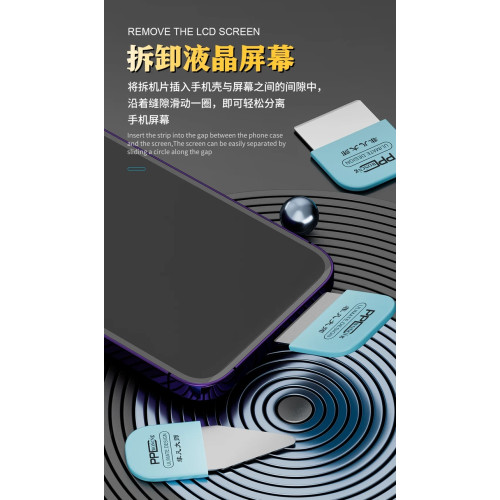 Універсальний набір ультратонких металевих лез PPD створений для делікатного розділення деталей у смартфонах, планшетах і ноутбуках. Тонке, але міцне лезо зі сталі з високою твердістю та стійкістю до нагріву допомагає безпечно знімати дисплеї та акумулятори, мінімізуючи ризик пошкоджень. Обмотана ручка забезпечує надійний хват і кращий контроль під час роботи.