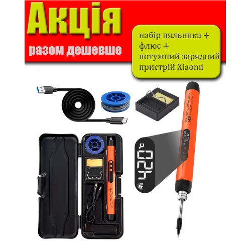 Цей набір для паяння зручний як паяльник для ремонту електроніки: відновлення роз'ємів, дрібні доробки на платах, робота з проводами. Завдяки компактності його легко взяти в рюкзак чи інструментальний кейс, до того ж він сумісний із павербанками.