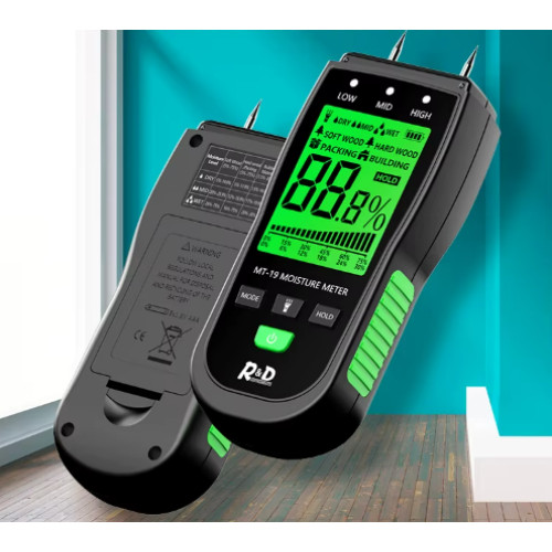 Вологомір деревини MT19 — професійний прилад для вимірювання вологості, що працює за методом електричного опору. Завдяки LCD-підсвітці показники чітко видно у темних приміщеннях, а міцний корпус із ABS зручний у щоденній роботі як на виробництві, так і на об'єктах.