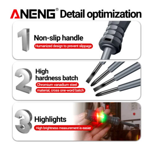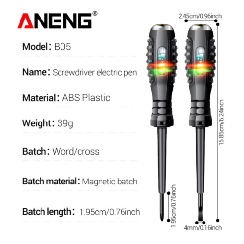 ANENG B05 — індикаторна викрутка з хрестовим жалом для побутових і монтажних робіт: заміна розеток, люстр, ремонт техніки та перевірка проводки. Ця викрутка з індикатором напруги поєднує функції звичайної електричної викрутки та простого тестера. Вона дозволяє швидко перевірити наявність напруги й виявити можливі проблеми без використання додаткових приладів.